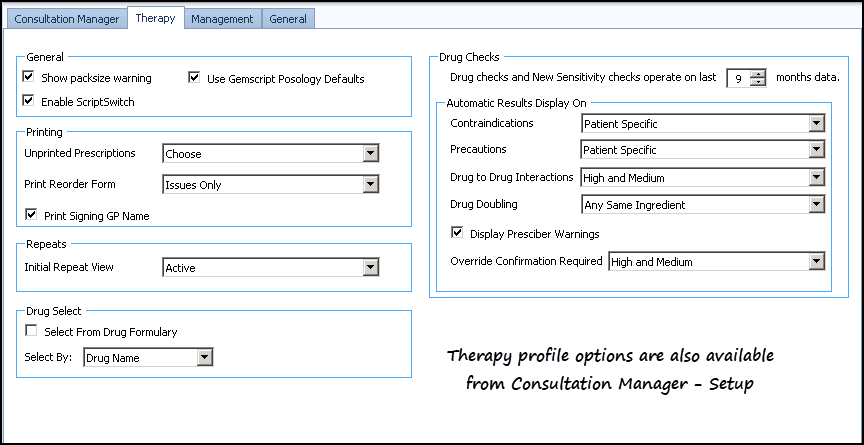 Profile options specific to Consultation Manager can be set up in the Consultation Manager tab:
