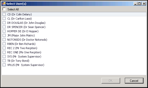 - Load from User - This option allows you to copy the value of a user setting to the selected user. This is particularly useful for complex settings such as lists of guidelines which do not have an interface in this app because of their complexity. Using this option the values set in Consultation Manager can be loaded into a profile and transferred to other users. Select User(s) displays to enable you to select the user with the setting you wish to copy. Tick the user you want to copy from and then click OK: