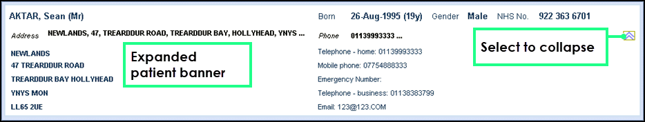 The Patient Banner always displays when a patient is selected and is the same standard patient banner used when accessing Vision 3 Apps from Consultation Manager. It displays the following patient demographic information: