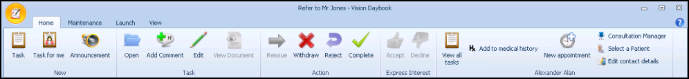The Home tab contains the options needed for day to day creating and actioning tasks:
