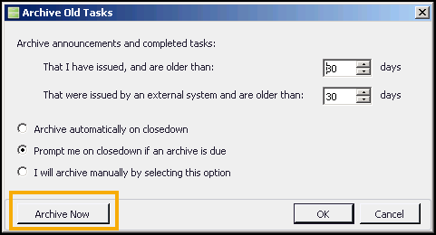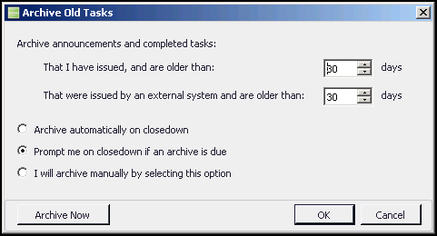 Prompt me on closedown if an archive is due - Select to be prompted before an archive is run.