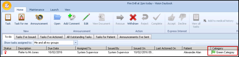 - The task displays with the relevant colour in the Category column. This can then be displayed in category order by selecting Category.