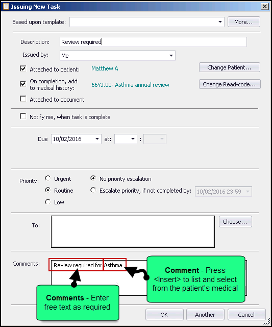 When adding comments to a task attached to a patient, you can display a summarised list, created from the patient’s record, by selecting the <Insert> key. You can also add any of the displayed records to the Comments section of the task you are creating.