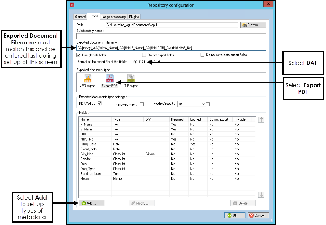 You must now tell the system which types of metadata are which, in the Exported documents filename, enter '%%[today]_%%[field:S_Name]_%%[field:F_Name]_%%[field:DOB]_%%[field:NHS_No]'.