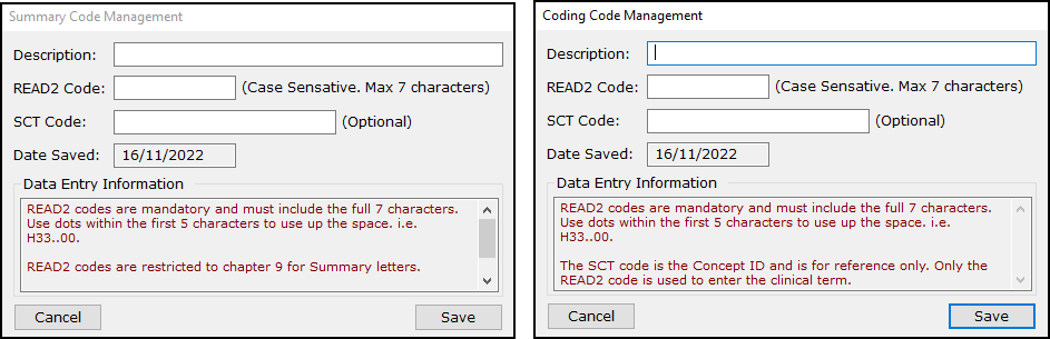 READ2 Code - Enter the full Read code required, remember the full stops and synonyms where appropriate. Guidance is provided in the Data Entry Information section.