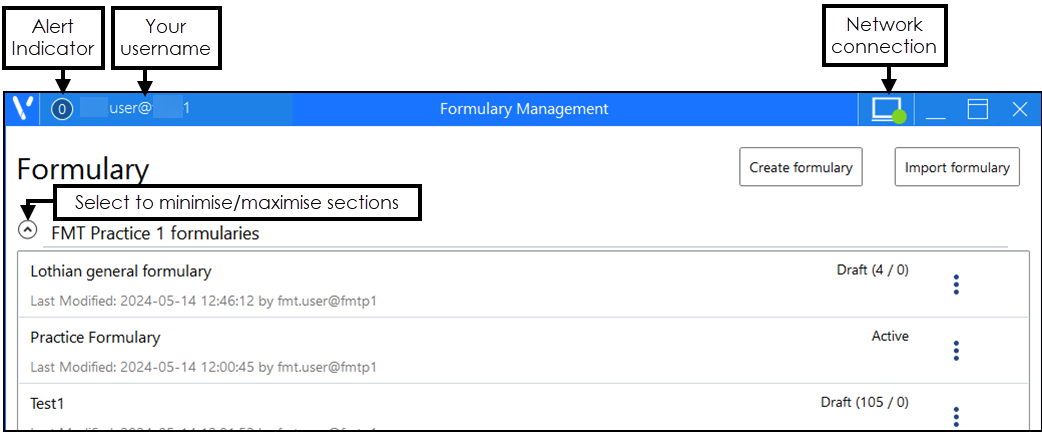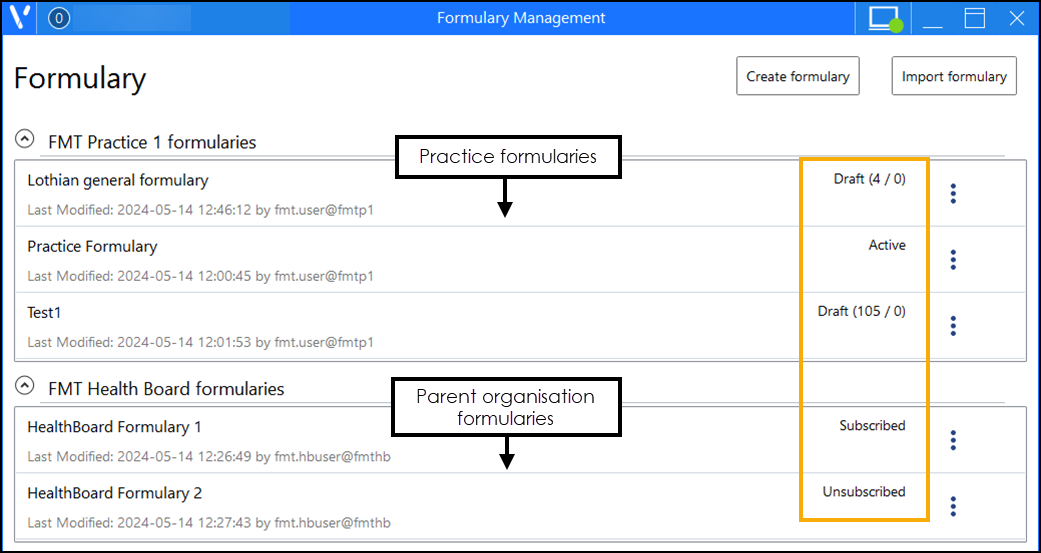 Practice log in - When you log into the Formulary Management Tool (FMT) at practice level, your practice formularies display at the top of the Formulary Management screen and any organisational level formularies display underneath.