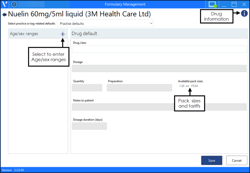 You can set multiple practice defaults to an item, separating them by age and/or sex range. Default information can be added from the Gemscript defaults or recorded manually.