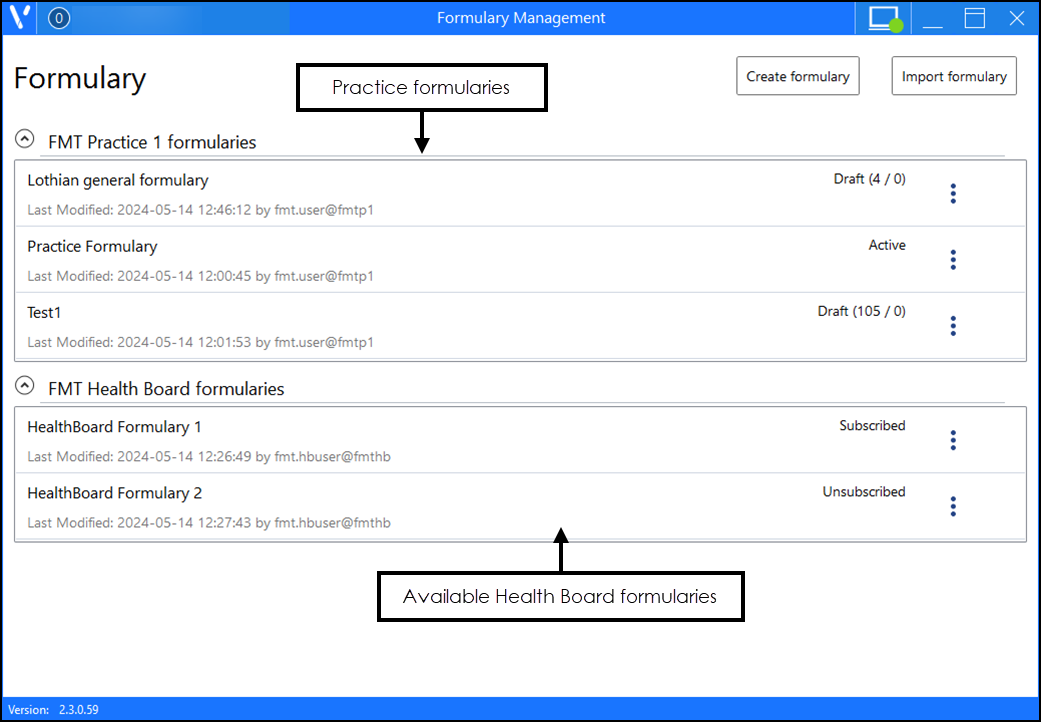 The Formulary Management screen displays, listing all the formularies you have access to, it includes both practice formularies and formularies from any parent organisations, for example, Health Boards.