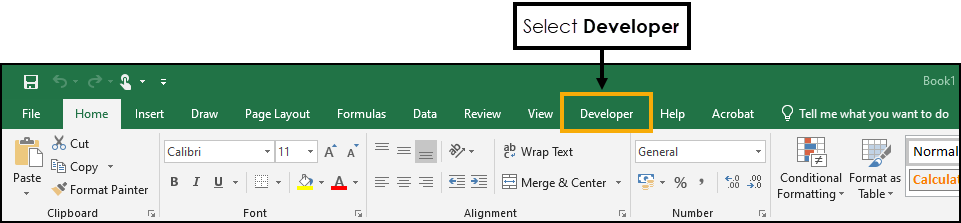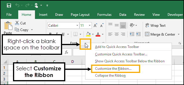 If the Developer tab does not display, right-click on a blank section of the toolbar and then select Customize the Ribbon from the menu.
