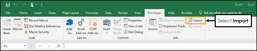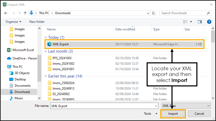 The Import XML screen displays, locate and highlight the XML export file, and then select Import.