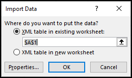 The Import Data screen displays, select OK to create the table in the existing worksheet.