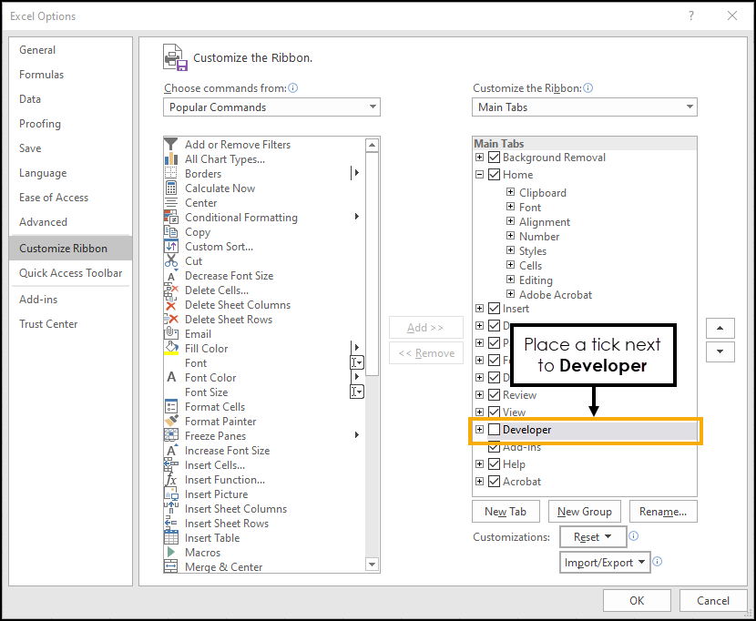 The Excel Options screen displays, from the Main Tabs section, place a tick next to Developer.