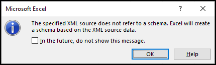 A message displays advising 'The specified XML source does not refer to a schema. Excel will create a schema based on the XML source data', select OK.