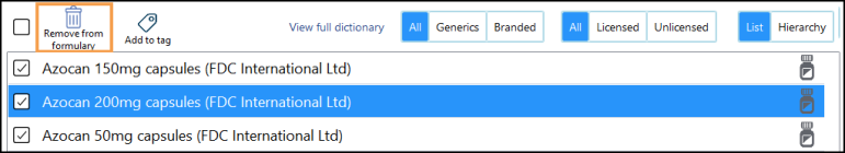 - Tick the item(s) you wish to remove, the Remove from formulary option displays in the toolbar.