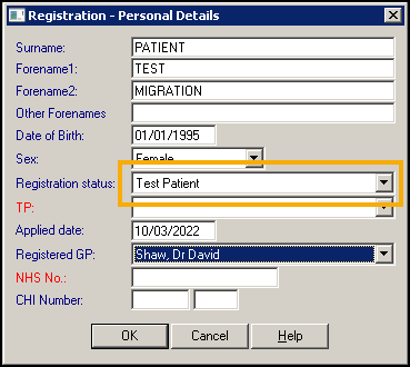 5. Complete the rest as required, ensuring that in Registration Status you select Test Patient: