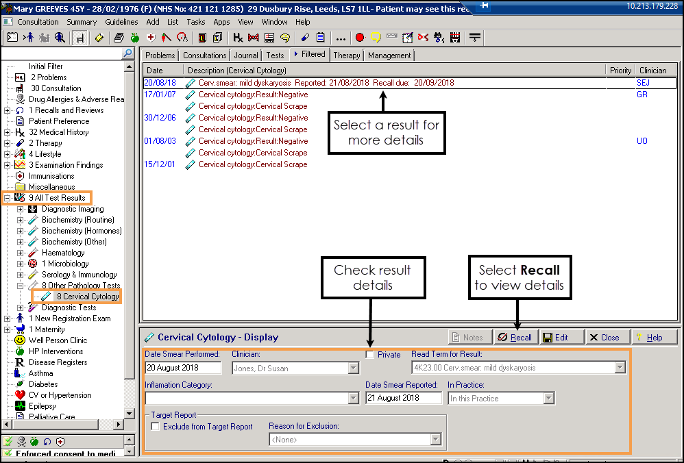 - Cytology - Find patients that have had a cervical smear and view the Cervical Cytology entries to check that the following has transmitted correctly: