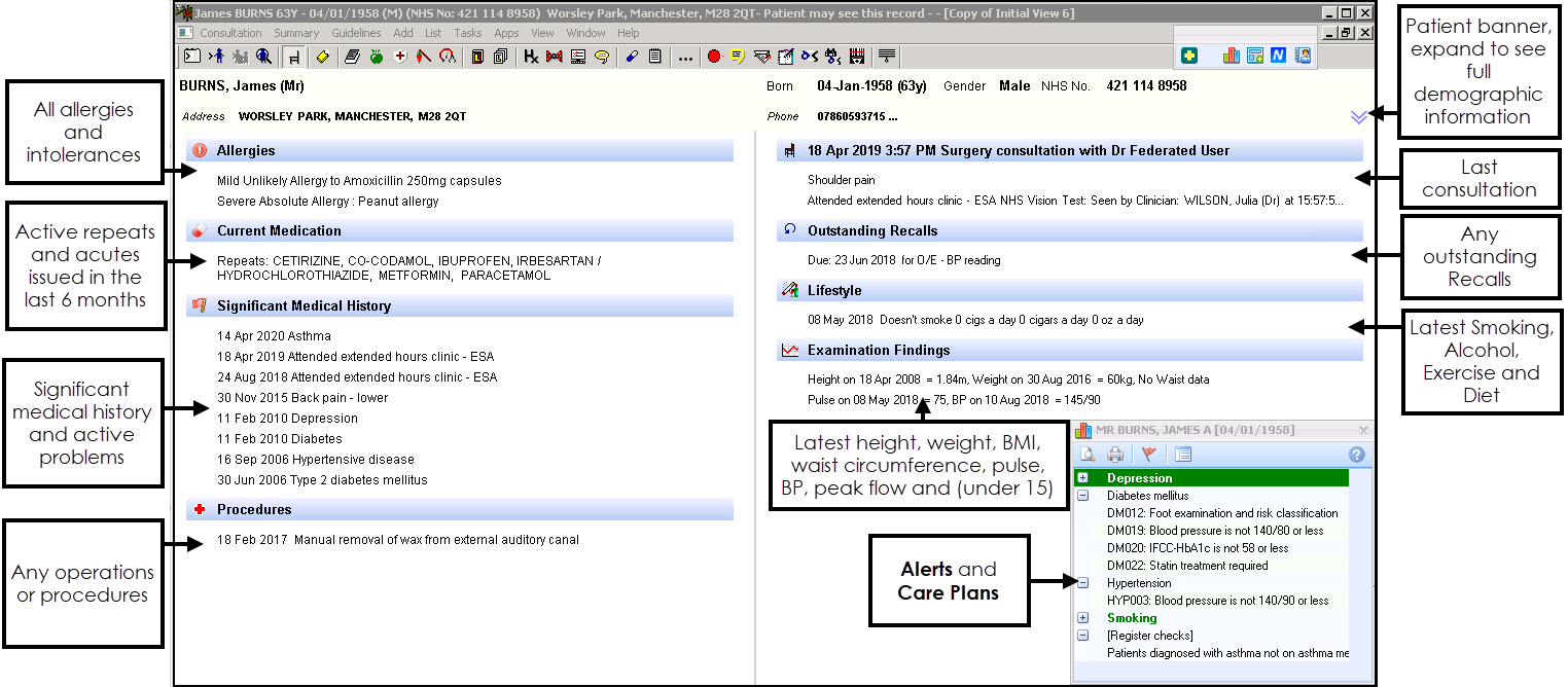 Patient Record - Check the consultation history and entries, for example, consultations, Key Information Summary, ePalliative Care Consent, immunisations, care reviews.