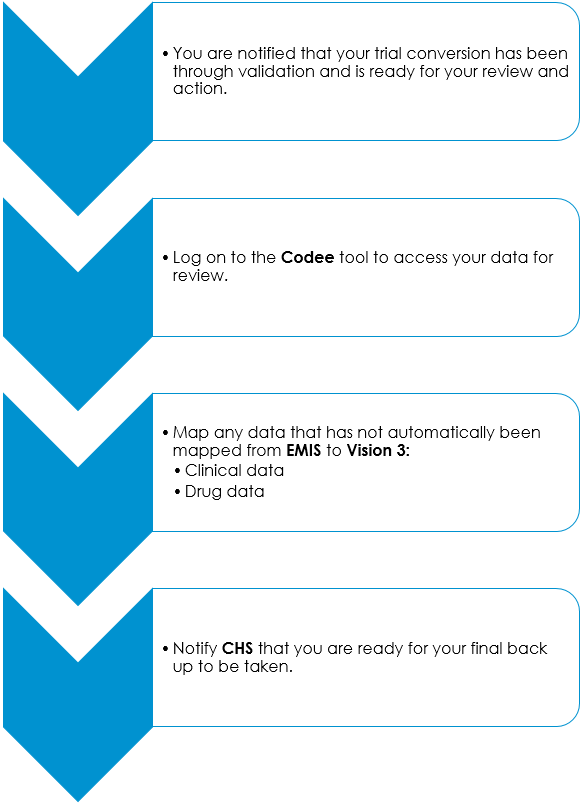 In order to ensure the best and most accurate migration of your data from EMIS to the Primary Care Hosted Solution, a validation process is run on your trial conversion data. The validation process identifies issues that you need to review and where possible map to Vision 3 accepted terms, prior to your final back up being taken.