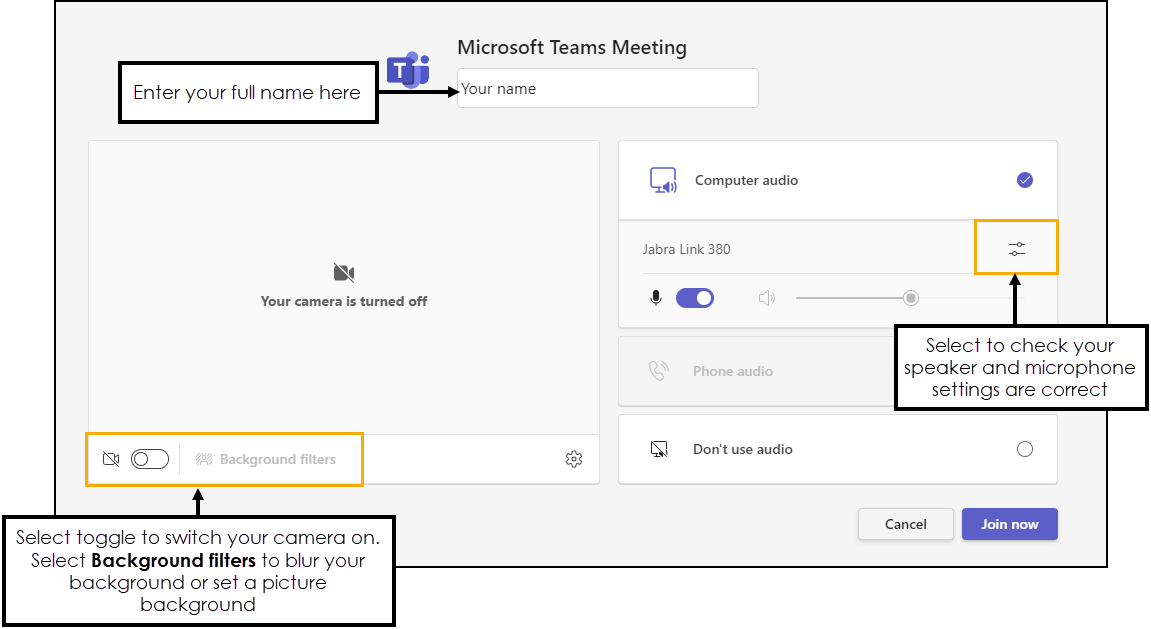 3. You may be prompted to enter your name and check your camera, speaker and microphone settings: