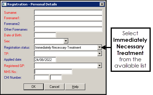 - Registration status - Select Immediately Necessary Treatment from the list.