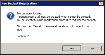 - Select OK and the New Patient Registration warning displays. If you are sure, select Yes:
