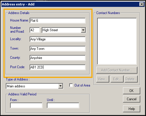 - The Address entry - Add screen displays, enter the address details as appropriate:
