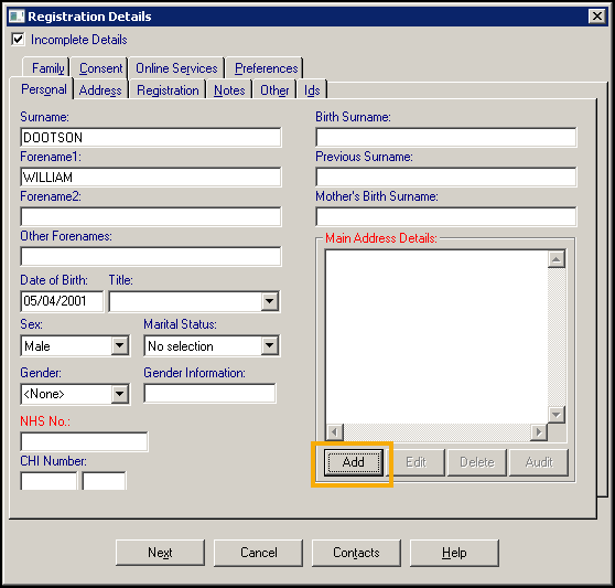 Important - Before adding a new patient, it is important to search for them in Vision 3 using their date of birth to ensure they have not been registered with your service in any way in the past. If you find them on Vision 3 you must add them via Re-registration and not as a new patient. See Re-Registering an Existing Patient for details.