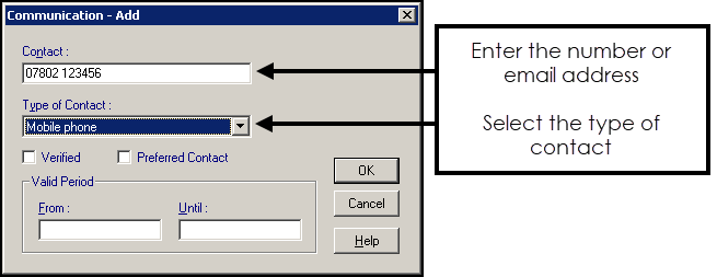 - The Communication - Add screen displays. Enter the contact details and from Type of Contact select the correct description: