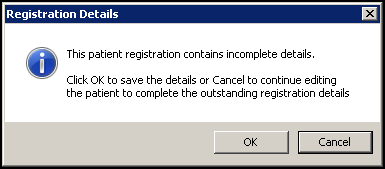 - If you have not been able to enter all the mandatory information, a Registration Details warning displays: