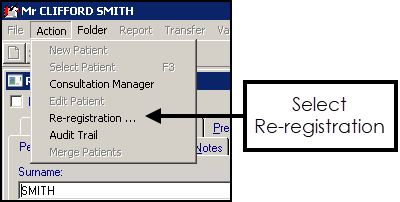 - The patient's Registration Details screen displays, select Action - Re-registration: