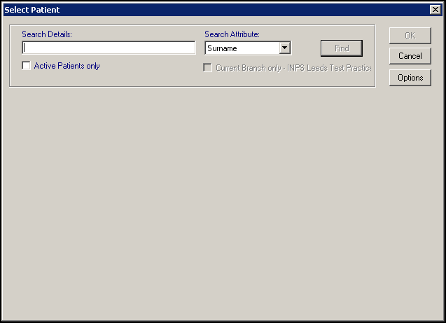 - Active Patients Only – The Active Patients Only tick box and Options are only available on the Select Patient screens where the user has rights in Security to view archived patients, see Selecting a Patient - Active Patients Only and Options for details.