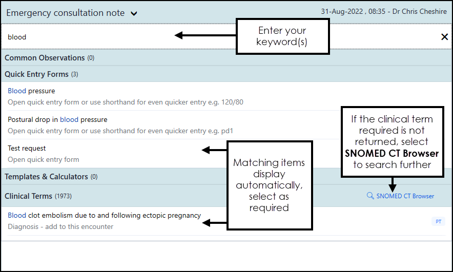 - Select the term required from the list and the relevant data entry form displays, or select SNOMED CT Browser to search further, see Using the SNOMED CT Browser if required.Note - SNOMED CT Preferred Terms are indicated with a PT indicator