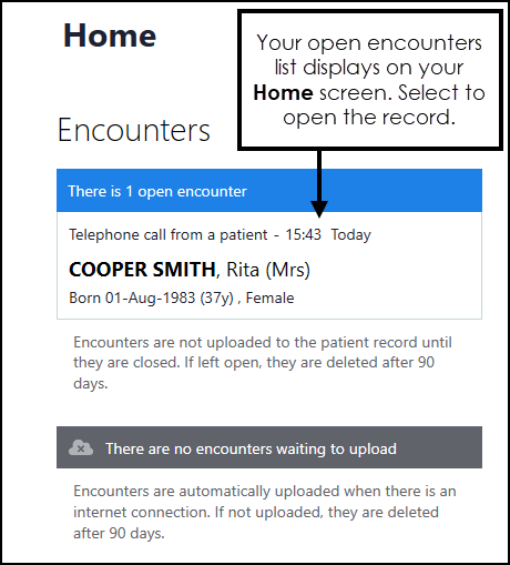 You may need to leave an encounter open, for example, if you need to come back to the patient record to add further data. However, when encounters are left open, they save to the device/workstation for 90 days only and can only be accessed by logging into Vision Anywhere on the same device as the same user.