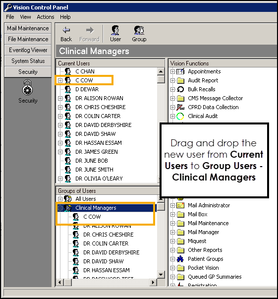 - In Current Users, locate your new clinician and drag and drop them into Group Users - Clinical Managers, or right click on another clinician, select Copy rights to another User, from the Select User screen select your new clinician and select OK: