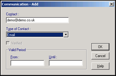- Select Communications Nos - Add - To add the staff member's email address. The Communication - Add screen displays, in Contact enter the number/email, in Type of Contact, select the type of contact number to add at least a valid email address for each staff member. Select OK to save: