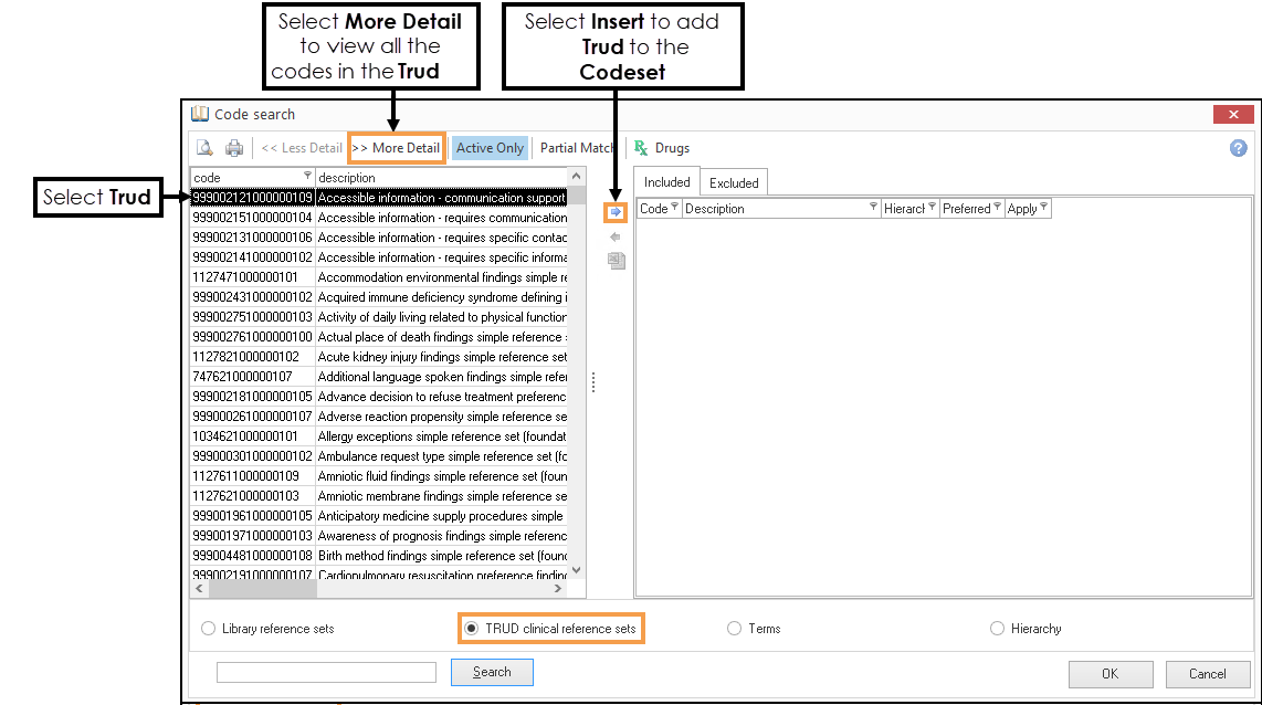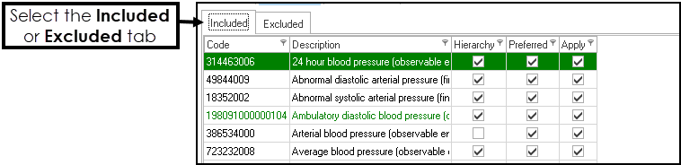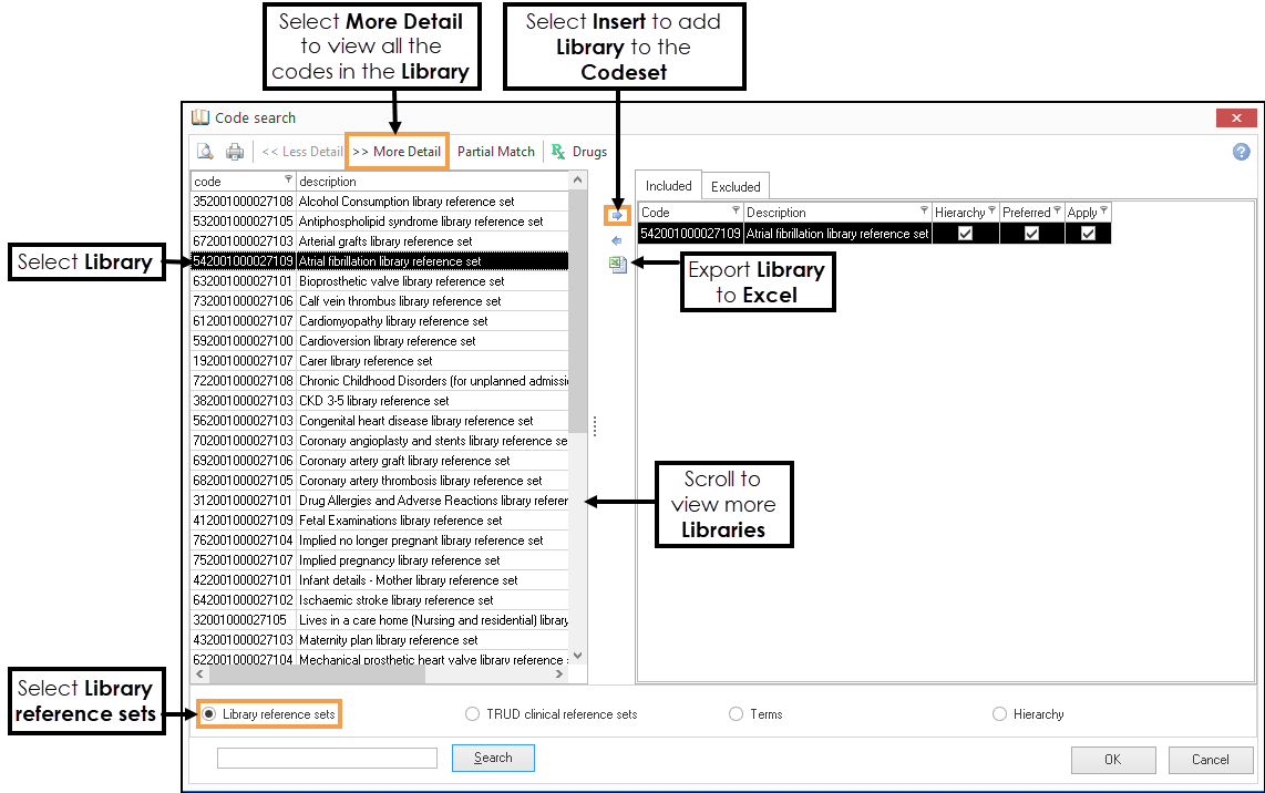to add the Library to your Codeset.The clinical codes display in the Included tab and the Description displays in the Excluded tab to ensure the Reference Set Description does not form part of the file.