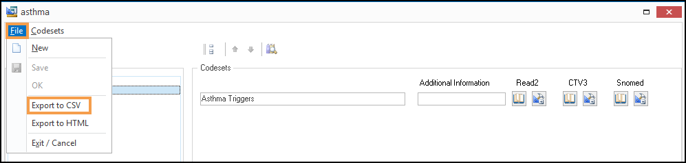 Within the Codeset Designer select the Codeset menu, select File, followed by Export to CSV.