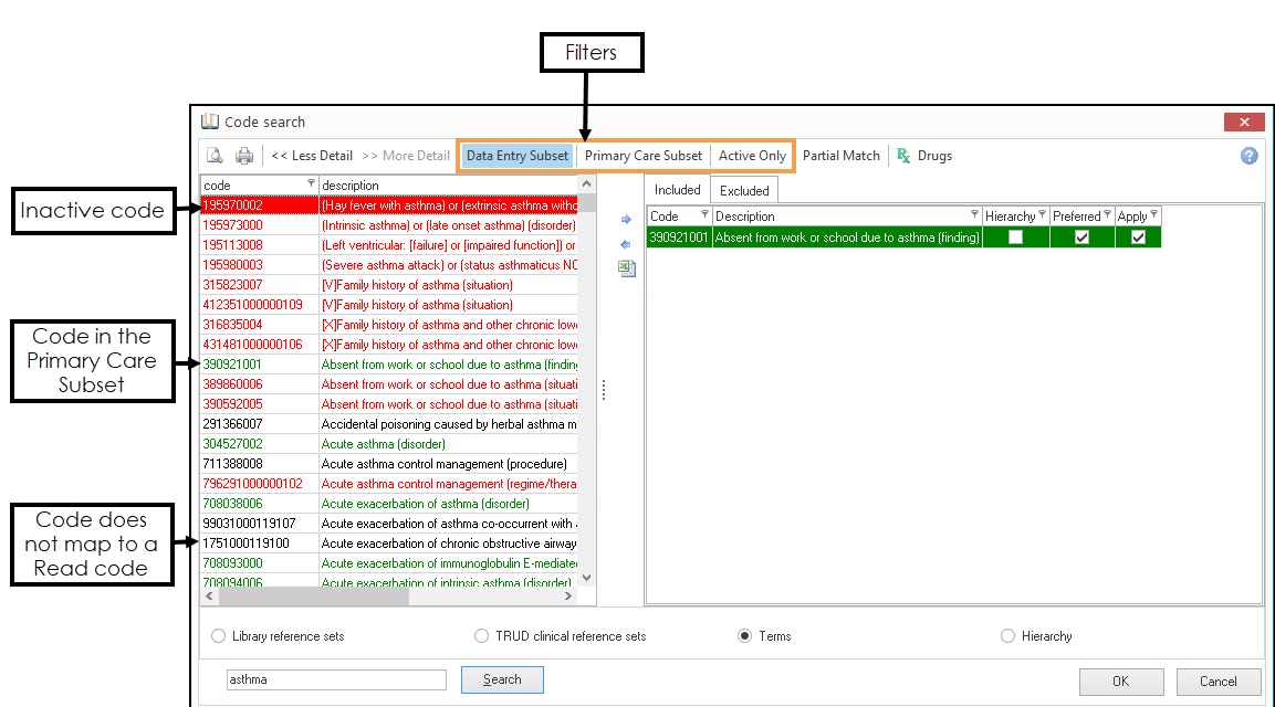 If the filter is removed inactive SNOMED CT codes also display, these items are red.Note - Inactive codes may still be used for searching on patient records. - Partial Match - Select Partial Match to search for part keywords. If this is not selected, only terms that exactly match your search display.