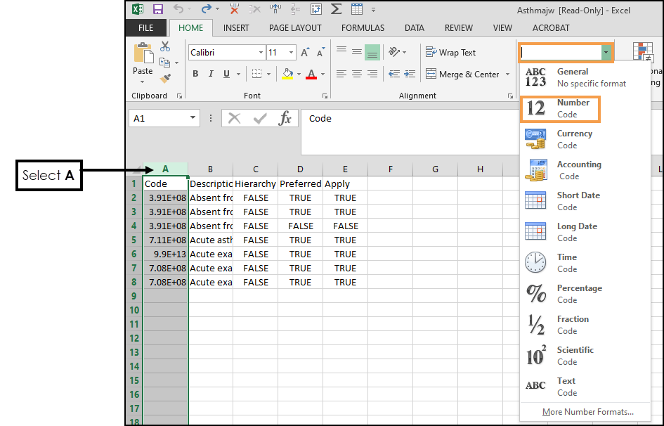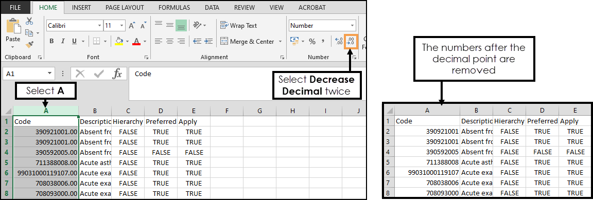 - Optionally, to remove the numbers after the decimal point, select A to highlight the column, from the Home tab, in the Number section, select Decrease Decimal
