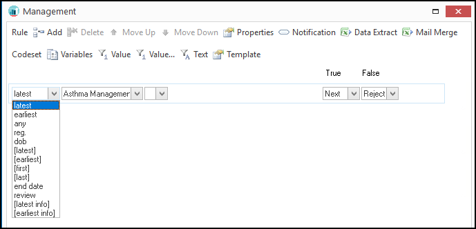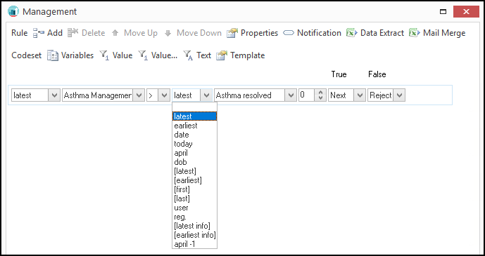 - [Latest]/[Earliest]/[First]/[Last] - These are variables that are used to store dates from one Rule Line and then used later on in another Rule Line in the Rule Node, or even in another Rule Node
