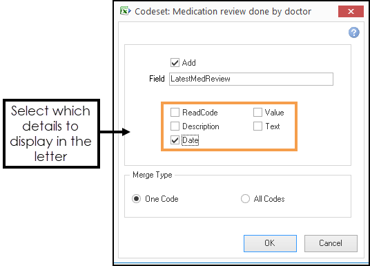In Field enter a description, this displays on the letter before merging.