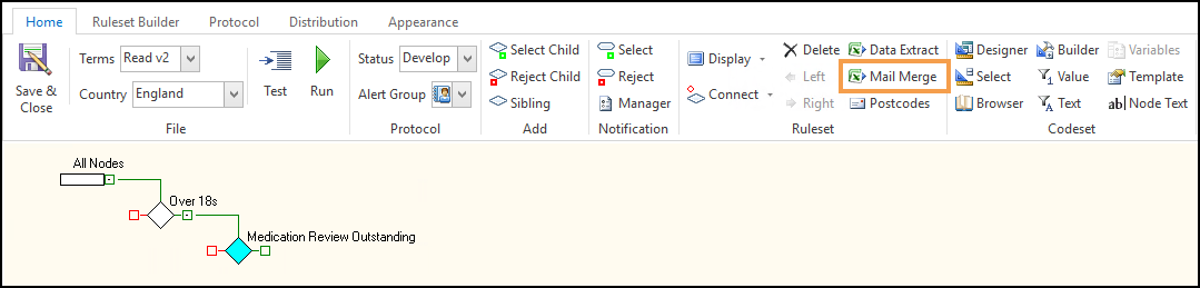 Highlight the rule that you want to create the mail merge field against and select Mail Merge