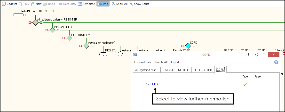 Note - A pathway must have at least 1 notification node for the indicator logic to display correctly at runtime/testing, otherwise all rule nodes display white. - To view the logic behind a Rule Node, select the Node followed by Info from the toolbar.