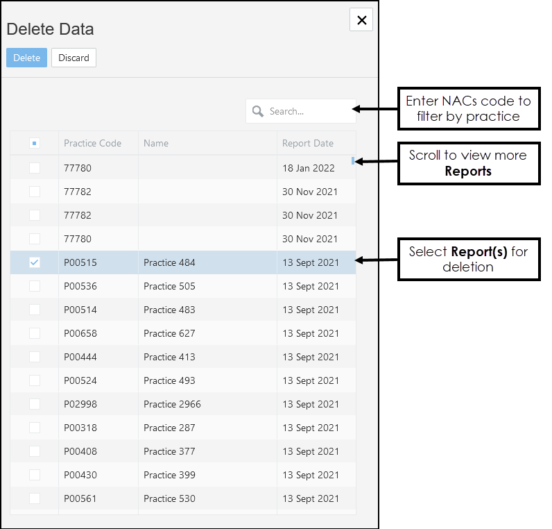 The Delete Data pop-up displays. - Optionally, enter a NACs code and select Filter to view the extracts by a specific practice.