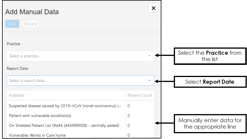 The Add function enables you to manually add data to practice extracts. This can be used in the event of an extract failure or for practices who have no extract facility.