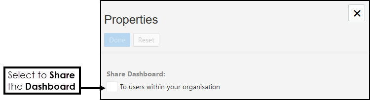 - Optionally, to share your Dashboard, select Properties from the toolbar, and within the Properties pop-up select Share Dashboard: To users within your organisation check box.