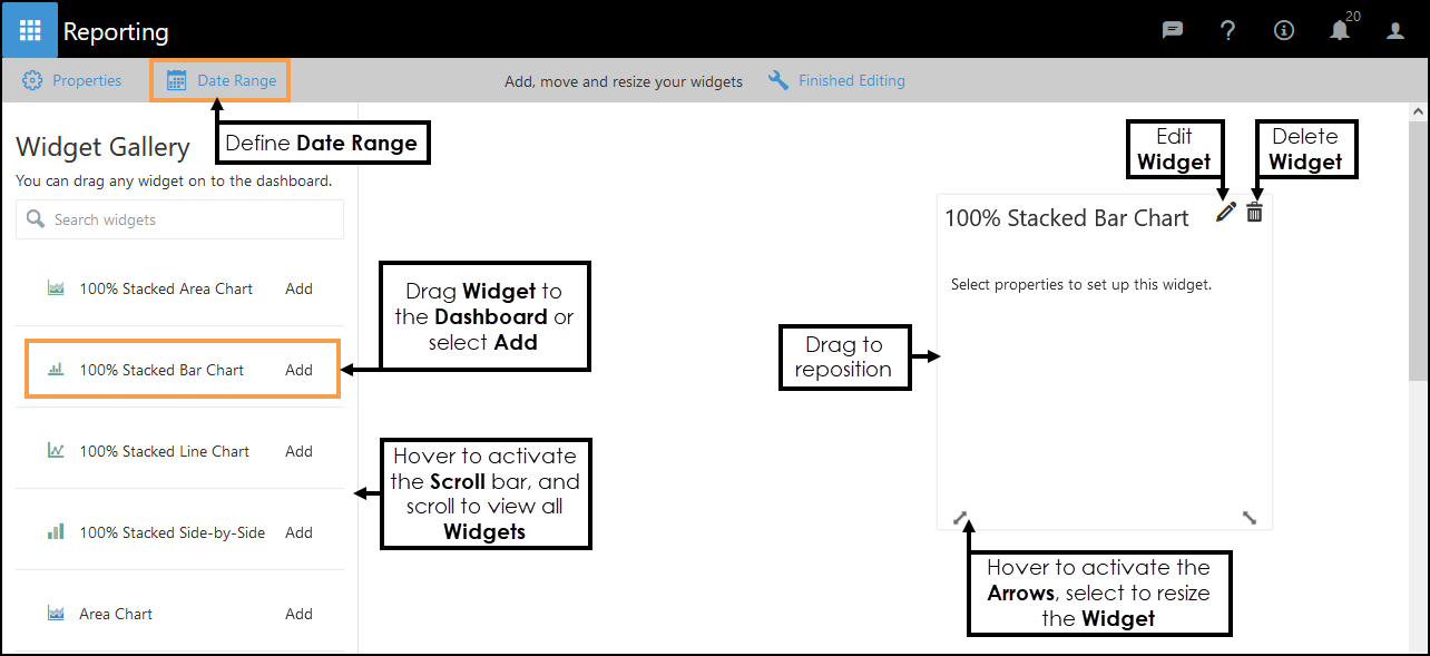 The Properties vary depending on the type of Widget. - Optionally, select a Date Range within the Widget.