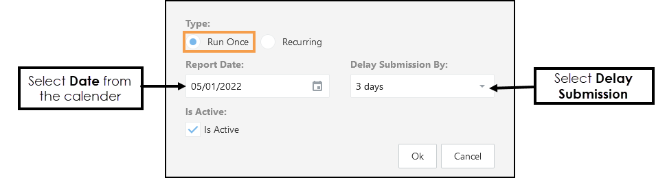 For example, if the Report Date was the 1st of the month, setting the Delay Submission By later than the 1st of the month allows the data to catch up. The maximum delay is 15 days. - Is Active automatically selects.