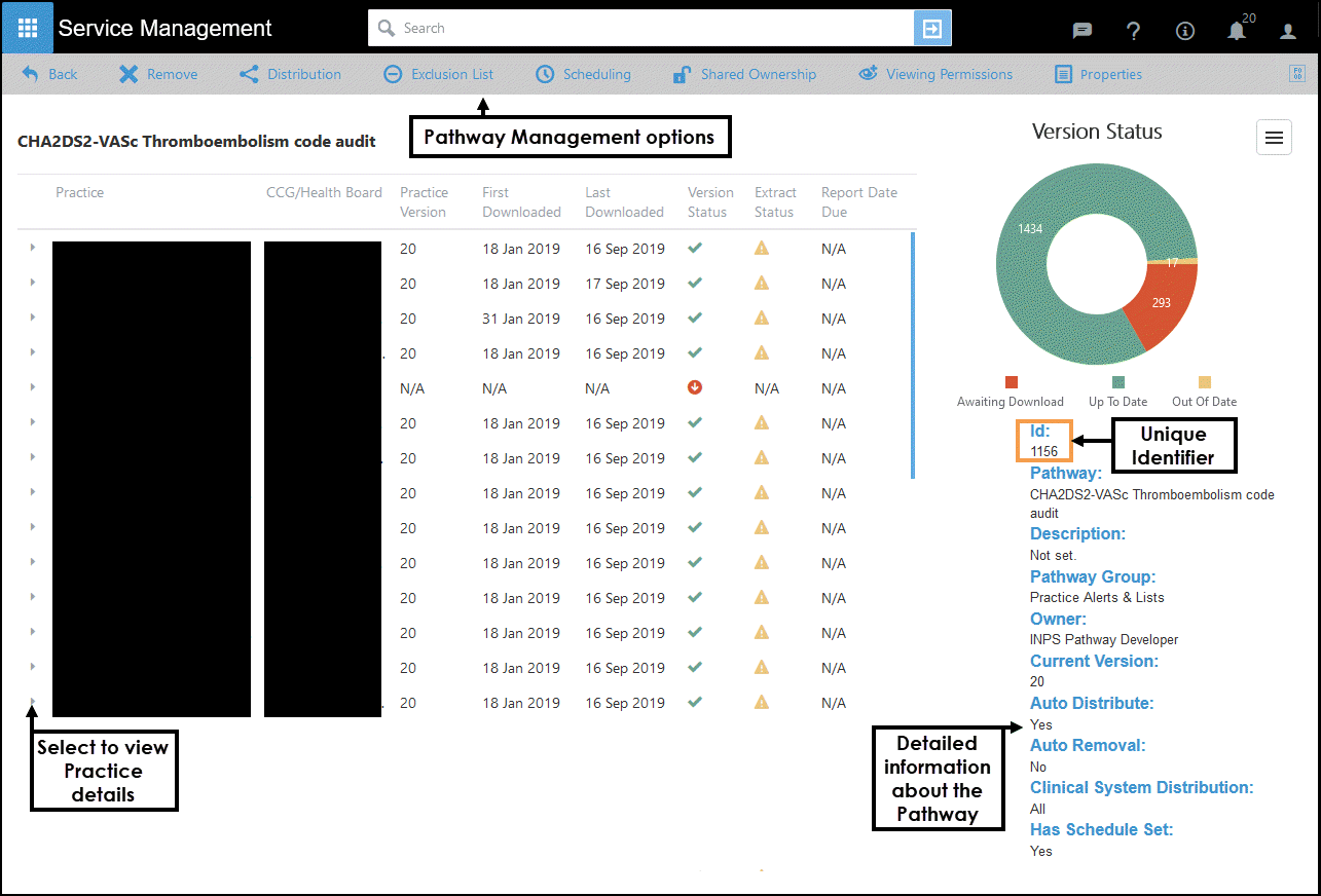 Select a Pathway to display the Version Status including; unique identifier, version, status, owner and practice details.