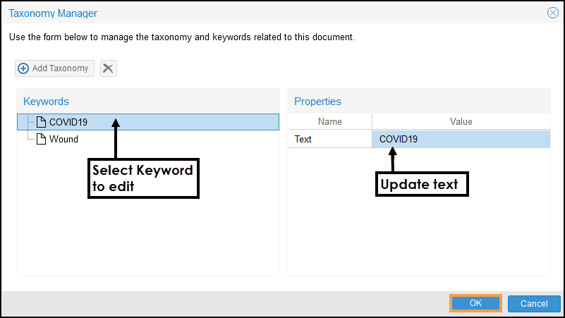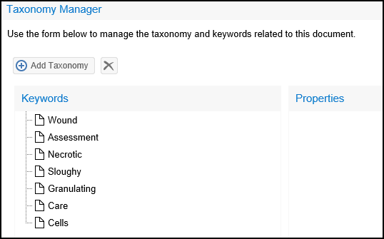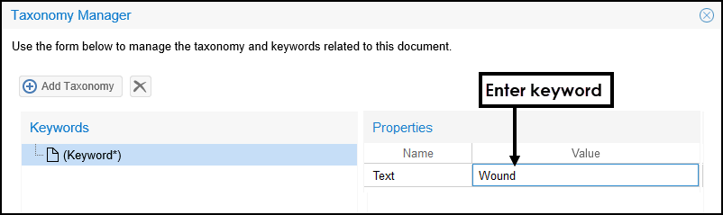 Select Add Taxonomy to add Keywords.